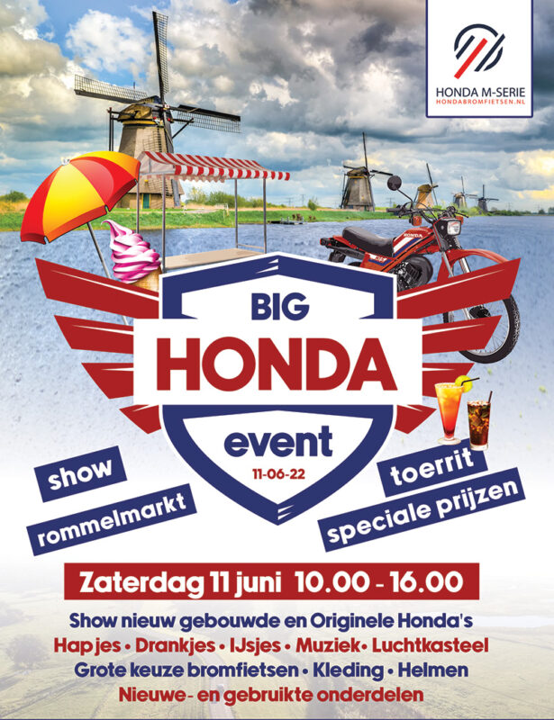Zet zaterdag 11 juni maar in de agenda! Op deze dag zal het eerste Big Honda M Event plaatsvinden in Ameide, met o.a. show van nieuw gebouwde en originele Honda bromfietsen, is er een Honda rommelmarkt, zijn er nieuw- en gebruikte onderdelen te verkrijgen tegen speciale actieprijzen en is er een toerrit. Daarnaast is er