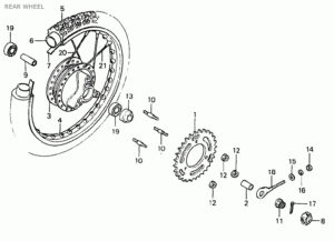 nummer 19,9,13,10,12 en 2 van tekening rear wheel en nummer 3 van rear brake panel