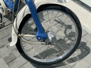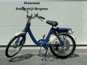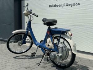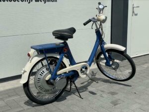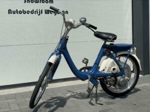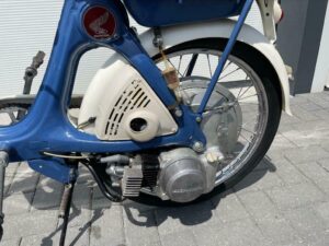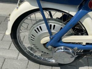 Volledig originele en in zeer goede staat verkerende Honda P50. Het betreft hier één van de eerste vier takt bromfietsen met de motor in het achterwiel.