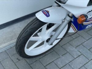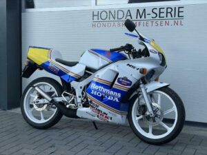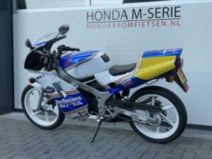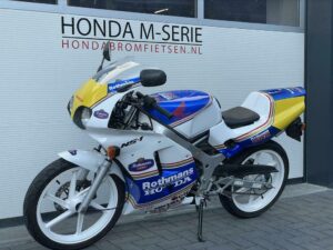 Hierbij bieden wij aan deze zeer unieke Honda NSR50. Dit is een Japanse NSR / NS1. Het officiƫle type van deze fiets is NS1 / NSB50R AC12-130 en is van 1994. Deze fiets heeft origineel een AC08 blok met 6 versnellingen. De fiets mag in Japan slechts 30 km. per uur maar met alles restricties eruit loopt deze Honda 90 km. Per uur. Het blok heeft de snelle GE2 cilinder erop staan.