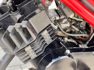 Verder kenmerken is het éénzits zadel en het high beam lampje in de cockpit.
