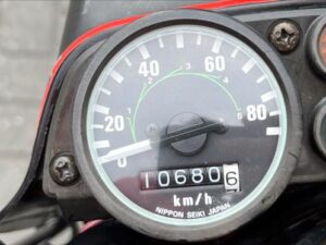 Let op de speciale kenmerken, de teller met de schakel momenten, het lange spatbord, het mono seat zadel, geen voeten steunen op de brug en het high beam lampje.